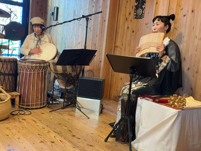 雅楽や古楽の笛、ジャンベをはじめとするアフリカンパーカッションとカリンバ、